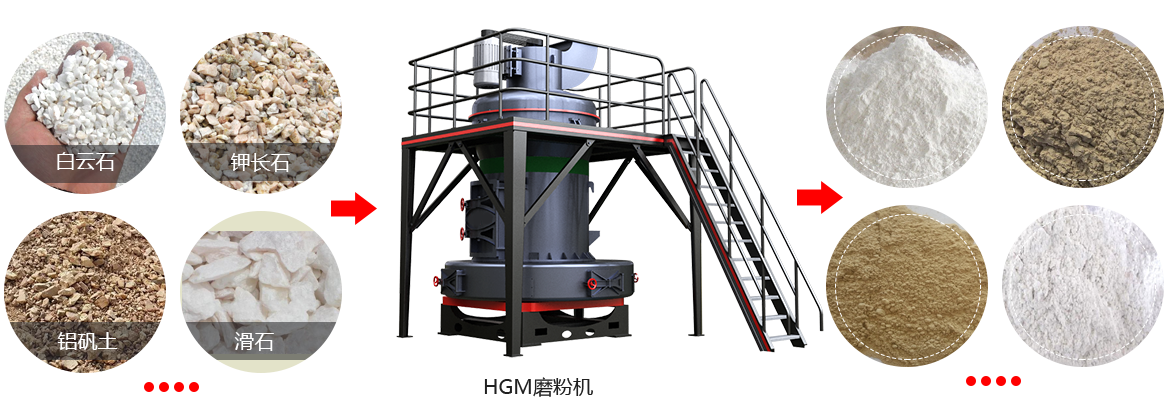 HGM型效率高超細磨粉機物料成品細度上可至800目(0.015mm),下可達80目(0.18mm),莫氏硬度9.3級以下,濕度7%以下的非易燃易爆物質均可以被輕松加工,是加工大理石、石英石、花崗巖、長石、白云石、方解石、石灰石、鐵礦石、滑石、重晶石、陶瓷、鋁礬土、膨潤土等物料的不二之選。